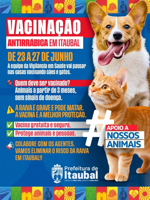 Atenção tutores! De 23 a 27 de junho, a equipe da Vigilância em Saúde vai percorrer os bairros de Itaubal vacinando cães e gatos a partir de 3 meses, que estejam saudáveis.