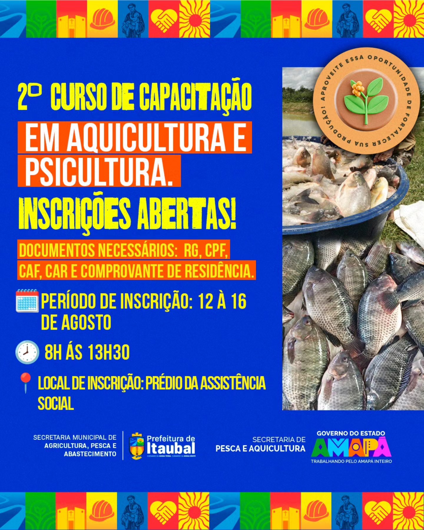 A Prefeitura de Itaubal, por meio da Secretaria Municipal de Agricultura, Pesca e Abastecimento, informa a todos os aquicultores e psiculturistas locais de Itaubal interessados que estão abertas as inscrições para o 2º Curso de Capacitação em Aquicultura e Piscicultura.