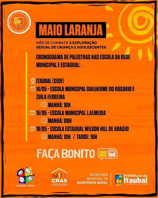 A Prefeitura de Itaubal, por meio da Secretaria de Assistência Social, está realizando um ciclo de palestras nas escolas municipais e estaduais como parte da Programação do Maio Laranja.